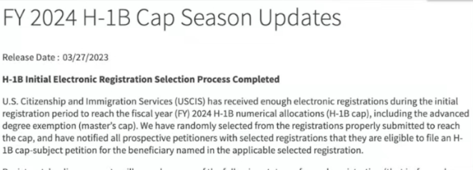 2023年的H1B抽签在3月24号落下帷幕。根据移民局官方发布的消息,第一轮抽签中,共有127,600名申请者被选中,比去年增加了40,100名。看似人数增加了,但是!权威预测今年的注册人数为75万左右。因此,保守估计,今年的中签率大概为17%左右,低于去年的26.37%,再创历史新低!参与抽签的小伙伴们,可以前往USCIS官网查看结果。