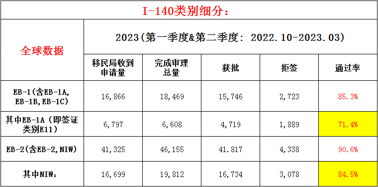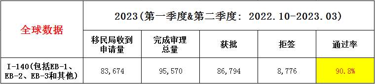 根据美国公民及移民服务局(USCIS)最新公布的2023财年第一季度和第二季度(2022年10月-2023年3月)的数据,I-140表格的接受、审批、拒签和通过率情况如下: