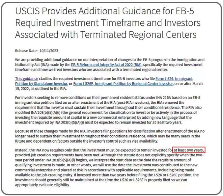 2023年10月11日,美国移民局发布有关新法EB5最低投资期的新政策,宣布新法EB5的最低投资期为2年,2年的起点从EB5投资款进入EB5有限合伙(NCE),并且按照法规要求“处于风险之中”开始算起,“处于风险之中”的要求包括资金可以由就业创造企业(JCE)使用。