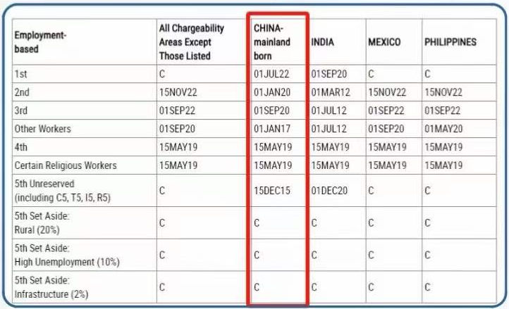 美国职业移民签证排期表,表A的情况: