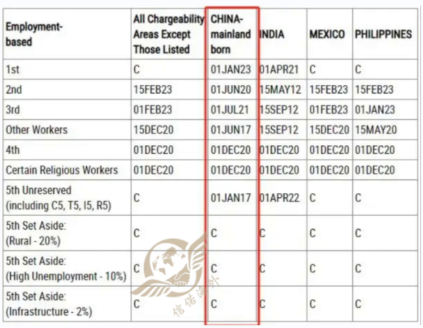 A表格为“移民签证的最后批准日期(移民排期)”(Application Final Action Dates ),就是绿卡可签发的日期,当表A日期前进到申请人的优先日期,申请人就可以拿到绿卡了。