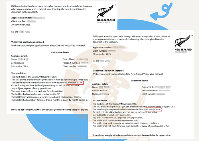 P先生此前已委托我们成功办理了美国B1/B2签证续签及日本三年多次签证。此次为与太太共度春节假期,计划前往新西兰旅行,特再次委托我们为其办理新西兰旅游签证。此次,申请难点在于P先生曾持有加拿大永居身份,因疫情影响未能满足居住要求,在试图再次入境时收到离境令,此后申请加拿大旅游签证亦遭拒。这段经历使他对此次新西兰签证申请深感担忧。尽管如此,我们的专业文案团队通过深入沟通与精准拆解,清陈述实际情况,突出P先生的稳定ties与真实旅行意图,最终成功协助P先生及其配偶获得三年多次往返签证,有力保障了他们的新春之旅圆满成行。